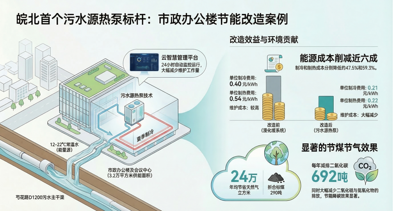皖北污水源标杆项目(腾博会官网冷热实施项目):利用污水管网能量源,年省天然气24万立方米,降碳692吨,减排二氧化硫4.92吨、氮氧化物1.74吨。