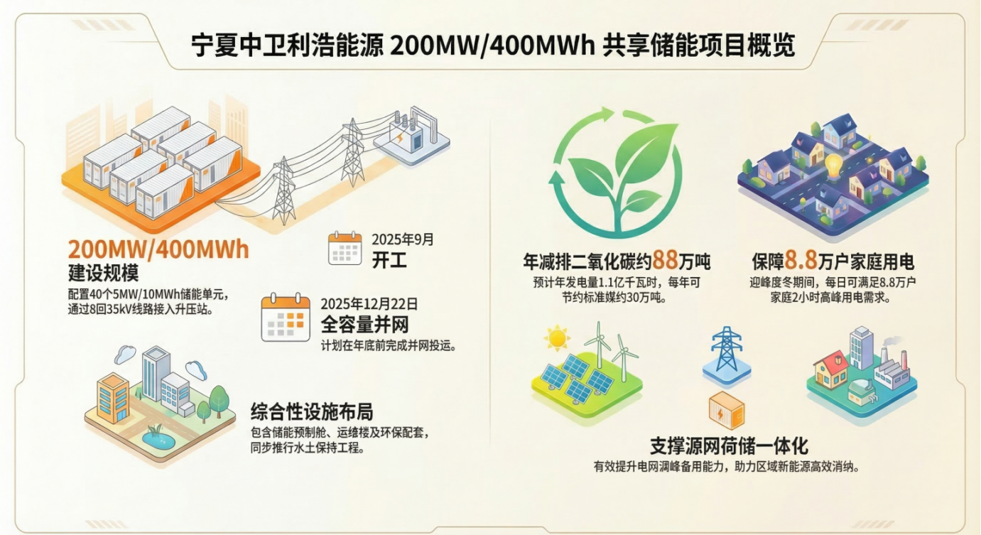 宁夏中卫共享储能项目(腾博会官网冷热实施项目):200MW/400MWh,年发电量1.1亿千瓦时,省煤30万吨,减排88万吨,保障8.8万户高峰用电。