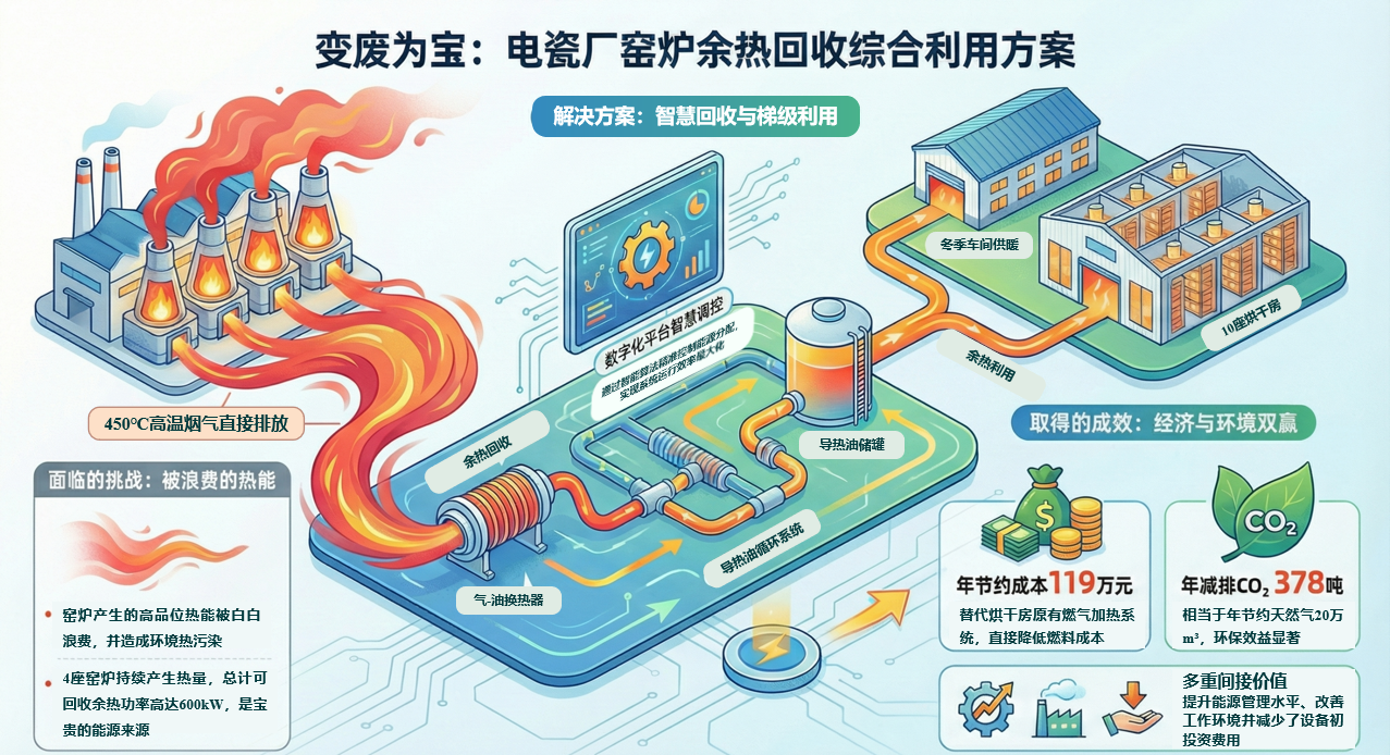 某电瓷厂窑炉余热回收项目(腾博会官网冷热实施项目):年节约运营成本119万元,减排CO₂ 378吨,替代燃气20万m³,实现余热回收与减碳双赢。