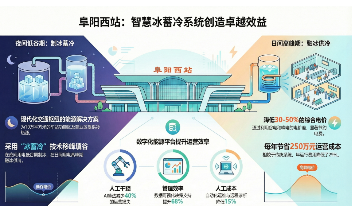 阜阳西站智慧冰蓄冷供能项目(腾博会官网冷热实施项目):服务10万㎡区域,年节省运营成本250万元,综合电价降低30%-50%;AI优化运行策略减少40%损耗。