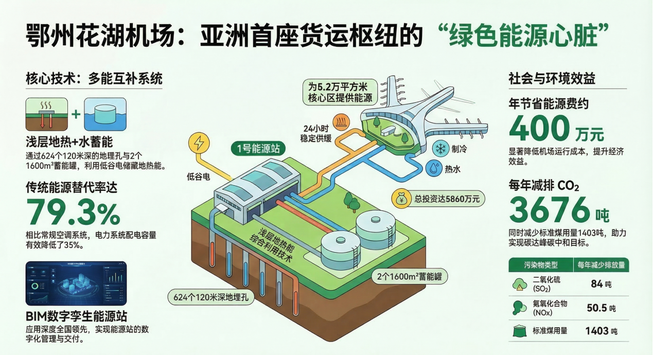 鄂州花湖国际机场能源站项目(腾博会官网冷热参与项目):冬季以浅层地热为核心,水蓄能+调峰燃气锅炉保障稳定供热;夏季靠浅层地热+水蓄能供冷,调峰冷水机组按需补能,实现清洁高效供能。